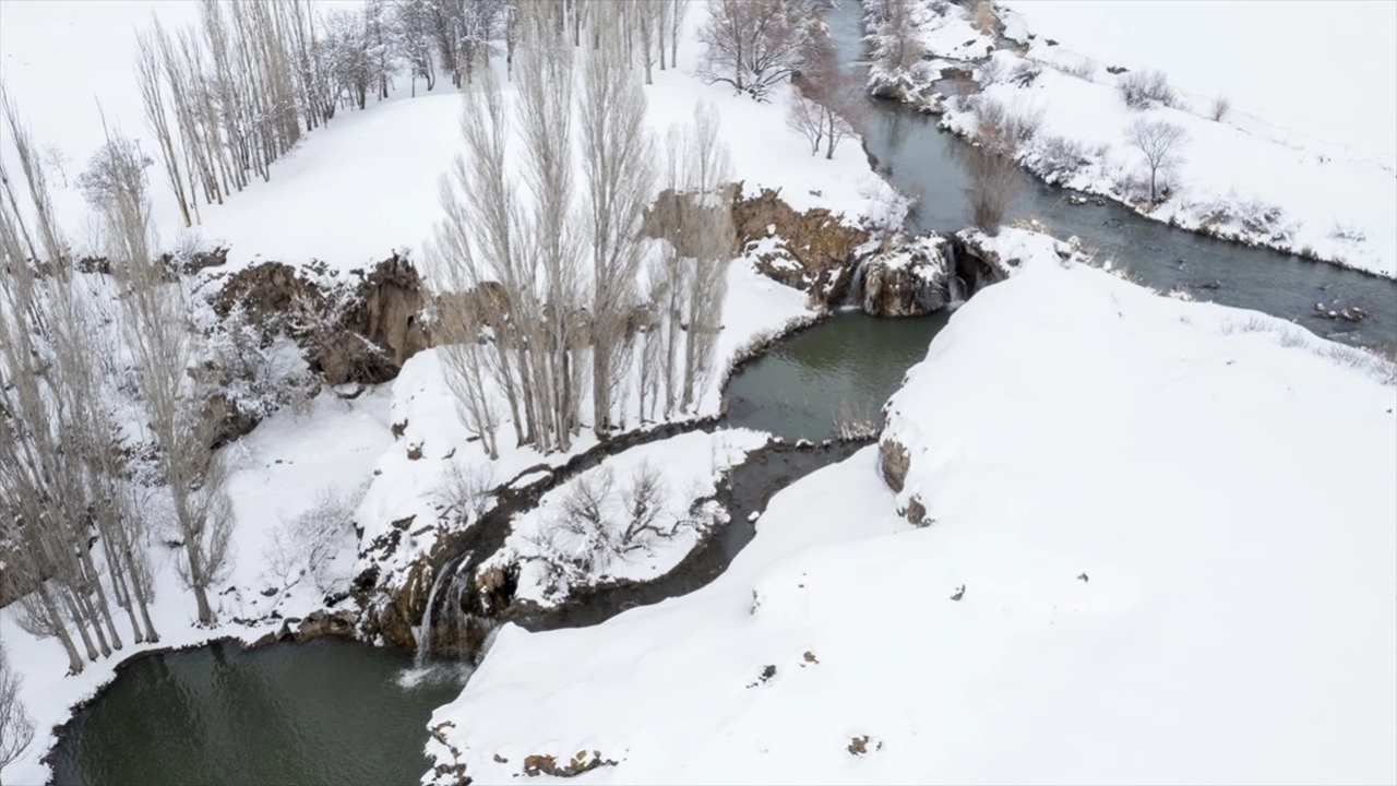 Muradiye ilçesinde yaklaşık 20 metre yüksekten akan şelale, kar örtüsünün arasından süzülen sularıyla ziyaretçilerinin hayran kaldığı güzelliğe büründü.