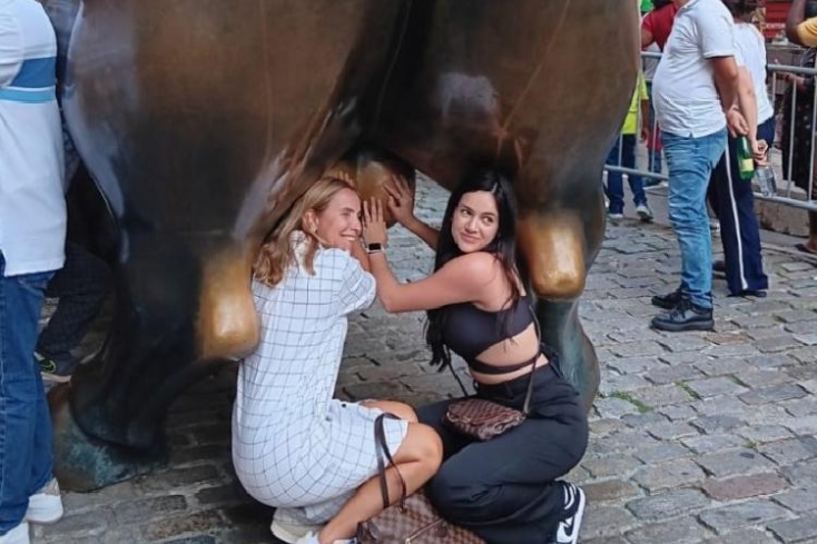 Başta Güney Amerika, Asya ve onları gören öbür tüm milletlerden turistler öfkeli boğaya sarılarak poz verdikten sonra bir de art tarafında oluşan uzunca sıraya girerek testislerini avuçlarken de fotoğraf çektirmeyi ihmal etmiyorlar. Günün hangi saati gelirseniz gelin heykelin önünde de gerisinde da uzun kuyruklar mevcut.