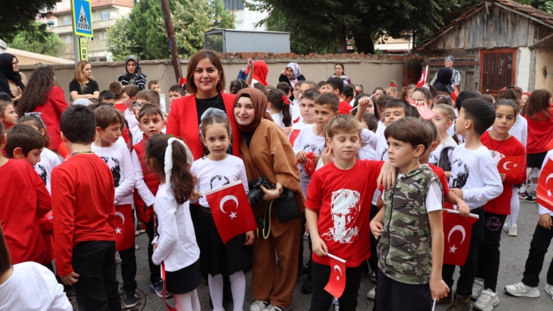 Kırmızı beyazlı tişörtlerle dün okul önünde bir araya gelen öğrenciler, uzun Türk bayrağı taşıyarak Fevzi Çakmak Caddesi boyunca bando eşliğinde yürüdü.