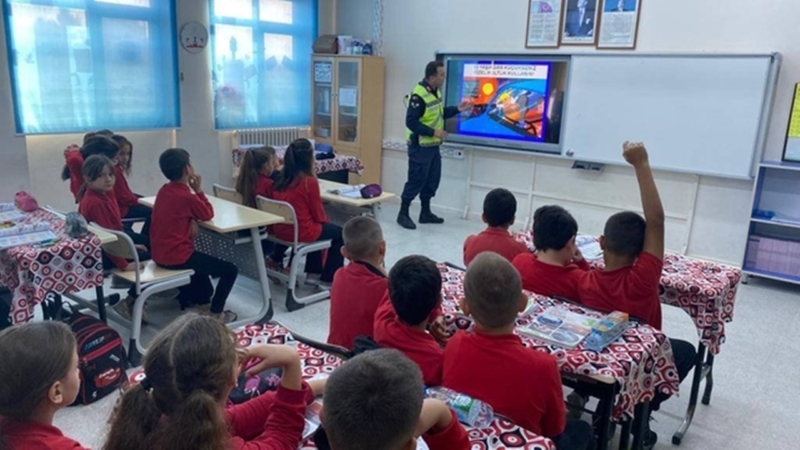 Ekipler öğrencilere temel trafik kuralları, trafikte yayaların uyması gereken kurallar ve okul servis araçlarında davranış kuralları konuları hakkında bilgilendirdi.
