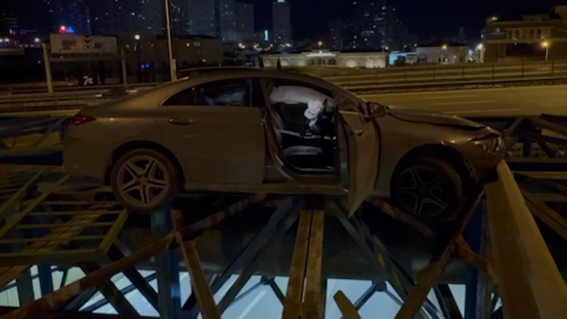 Acıbadem Mahallesi Çeçen Sokak’tan çıkarak Uzunçayır Kavşağı’na dönmeye çalışan C.T. idaresindeki 34 GJJ 599 plakalı otomobil bariyerlere çarparak arkasındaki köprüde asılı kaldı.