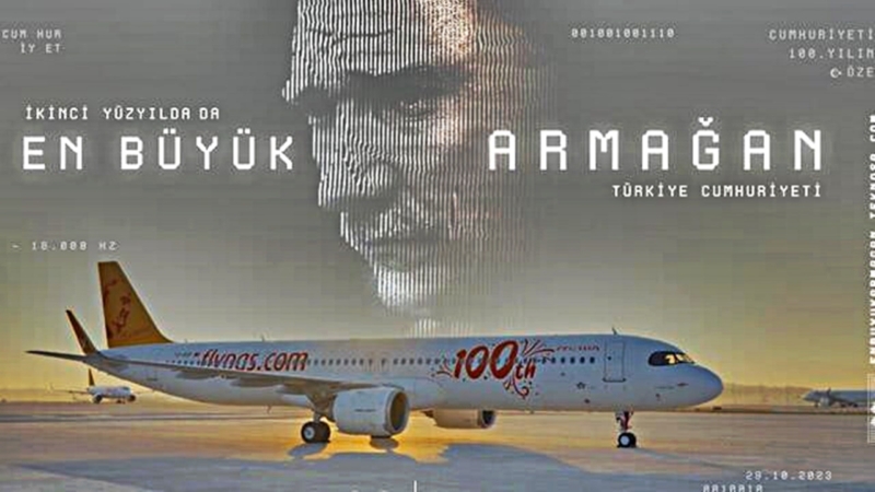 Uçuş için koltuklarında yerini alan yolcular her zaman alışık oldukları anons dışında, kaptan pilotun özel anonsu ile Teknosa’nın “İkinci yüzyılda da en büyük armağan: Türkiye Cumhuriyeti” projesi kapsamında yapay zekayla ürettiği Atatürk’ün sesini duydu.