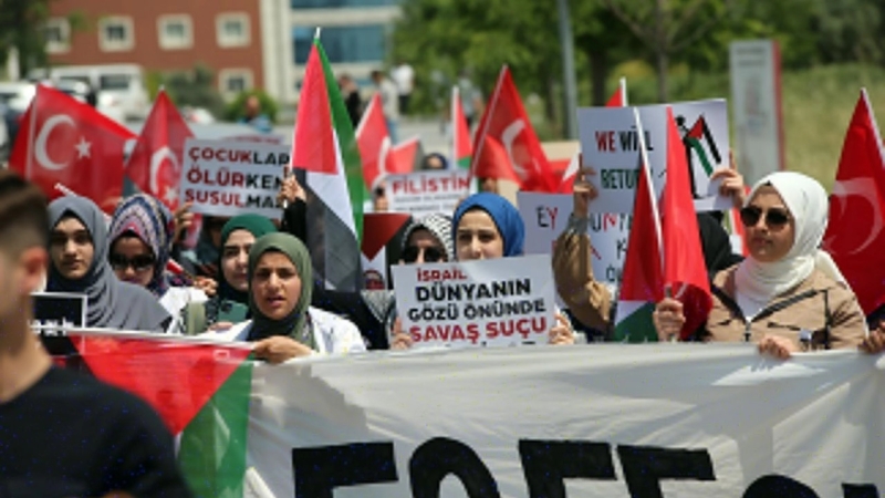 AK Parti Gençlik Kolları Üniversiteler Teşkilatı (ÜNİAK) tarafından organize edilen etkinlik için Recep Tayyip Erdoğan Üniversitesi İlahiyat Fakültesi önünde bir araya gelen öğrenci ve akademisyenler, Türkçe ve İngilizce yazılı döviz ve pankart açtı.