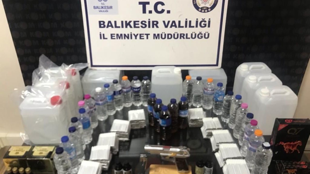 İlçe merkezinde belirlenen adreslerde yapılan aramalarda bir tabanca ve bu silaha ait şarjör, yaklaşık 60 litre sahte alkol, 4 litre viski aroması, 1000 adet dolu makaron (filtreli sigara kağıdı) ile 46 cinsel uyarıcı hap ele geçirildi.
