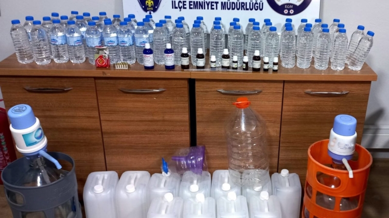 Bu kişinin adresine eş zamanlı operasyon düzenleyen ekipler, yaptıkları aramada 58,5 litre sahte rakı ve votka ile 10 tabanca mermisi ele geçirdi.