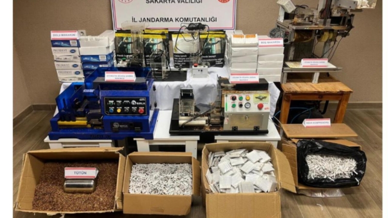Ev ve depoda yapılan aramalarda, 11 bin 700’ü doldurulmuş 45 bin 500 makaron, 20 kilogram kıyılmış tütün, 5 otomatik sigara dolum makinesi ve hava kompresörü ele geçirildi.