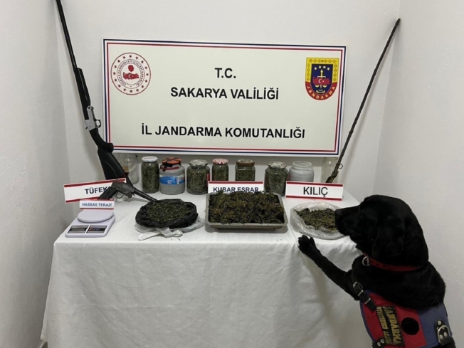 Adreste yapılan aramada, 4 kilogram esrar, 2 av tüfeği, kılıç ve hassas terazi ele geçirildi.