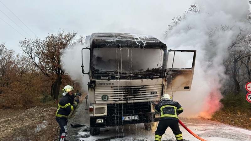 Resul A. idaresindeki 54 AFG 119 plakalı saman yüklü tır Doğanca köyü yakınlarında hareket halindeyken çekici kısmından alev aldı.