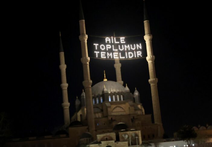 Edirne'deki Selimiye Camisi'ne, “Hoş geldin on bir ayın sultanı” yazılı mahyanın ardından ramazan ayının ikinci yarısı için “Aile Yılı”nı vurgulamak amacıyla “Aile toplumun temelidir” yazılı mahya asıldı.