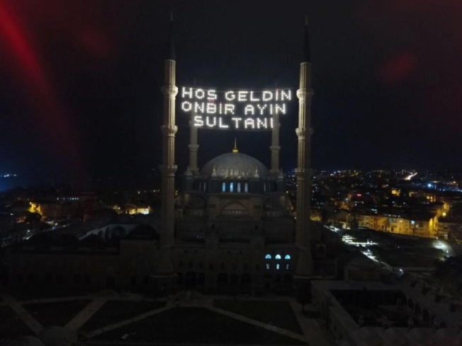 Mimar Sinan'ın ustalık eseri Selimiye Camisi minarelerine takılan “Hoş geldin on bir ayın sultanı” yazılı mahya ışıklandırıldı.
