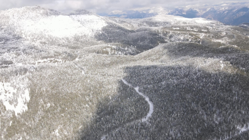 İlçenin 1764 rakımlı Ulus Dağı'nda kar yağışının ardından oluşan beyaz örtü ve sis bulutları dronla görüntülendi.