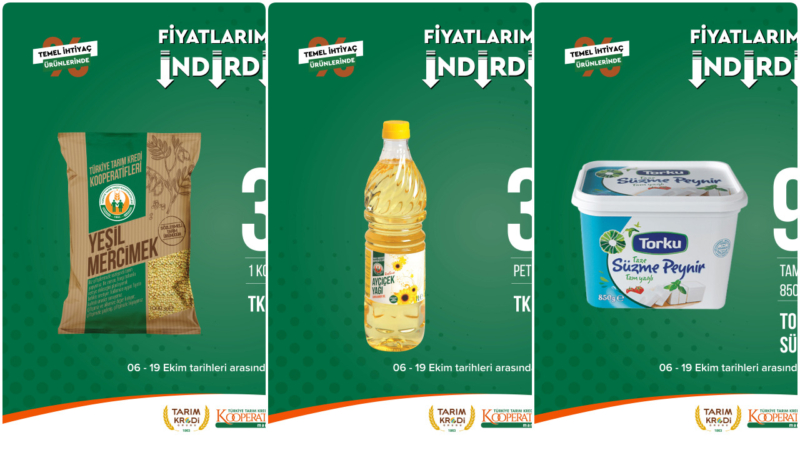 14-15 Ekim tarihlerinde Tarım Kredi Marketler’de; 1L TK Pet Ayçiçek Yağı 39 TL, 1 kg TK Anadolu Osmancık Pirinç 35.25 TL, 500 g TK Tam Yağlı Taze Beyaz Peynir 57.90 TL, 850 g Torku Tam Yağlı Taze Süzme Peynir 94.90 TL, 3 kg TK Filiz Siyah Çay 279.90 TL, 80’li Baby Turco Doapadan Bebek Bezi 199.90 TL’den satışta olacak.