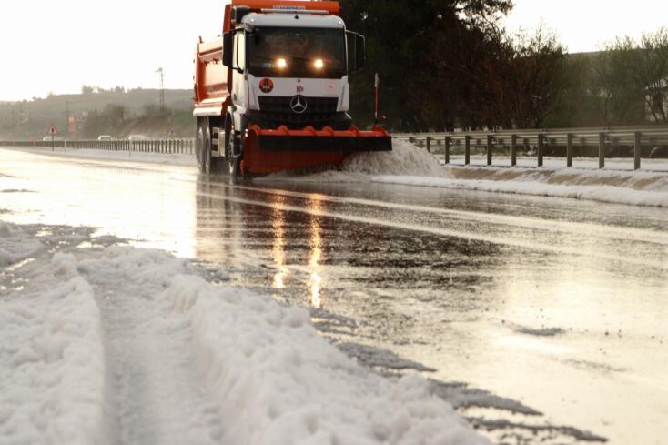 Karayolları ekipleri iş makineleri yardımıyla yol kenarlarında biriken dolu öbeklerini temizleme çalışması başlattı.