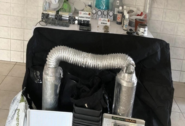 Aramada, iki iklimlendirme çadırı, üç vantilatör, termometre, fanlar, bitki besleyici sıvı, aydınlatma sistemi, hassas terazi ile bir miktar esrar ve kenevir tohumu ele geçirildi.