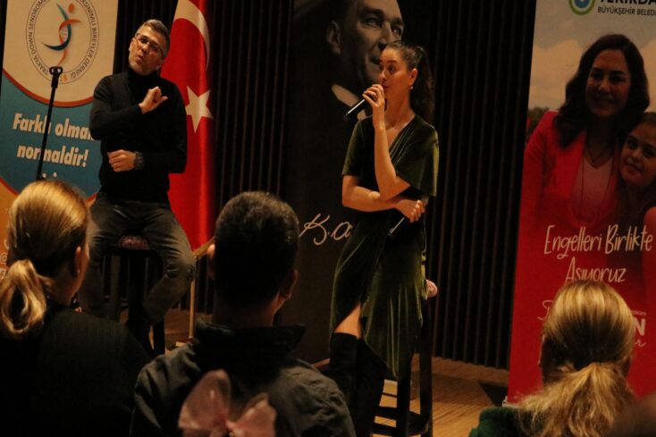 Programda oyuncu Meryem Asil ve işaret dili tercümanı Tuna Akgün, işitme engelli ve down sendromlu bireyler ve ailelerine, engellilerin yaşanmış hikayelerini ve tecrübelerini aktardı.