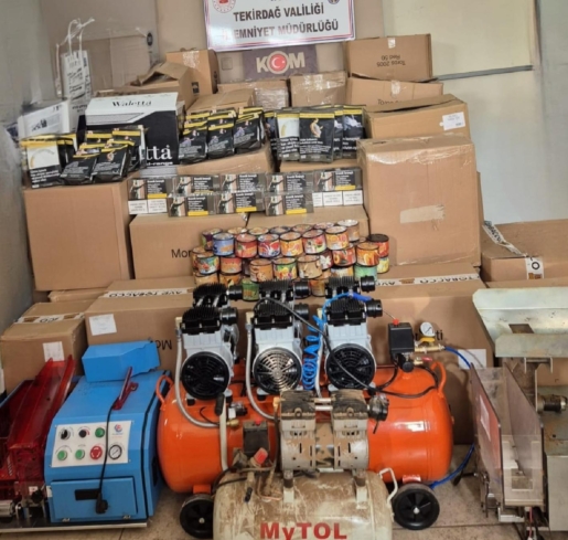 Belirlenen adreslere düzenlenen operasyonda, 305 bin 260 makaron (filtreli sigara kağıdı), 490 kilogram tütün, 17 kilo 250 gram nargile tütünü, 2 kompresör, 2 makaron doldurma makinesi ve 2 elektronik sigara ele geçirildi.
