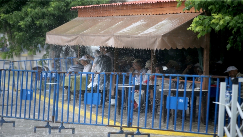 Vatandaşlar, miting alanı çevresindeki işyerlerinin tenteleri ile alanda kurulan çadırların altına girerek sağanaktan korunmaya çalıştı.