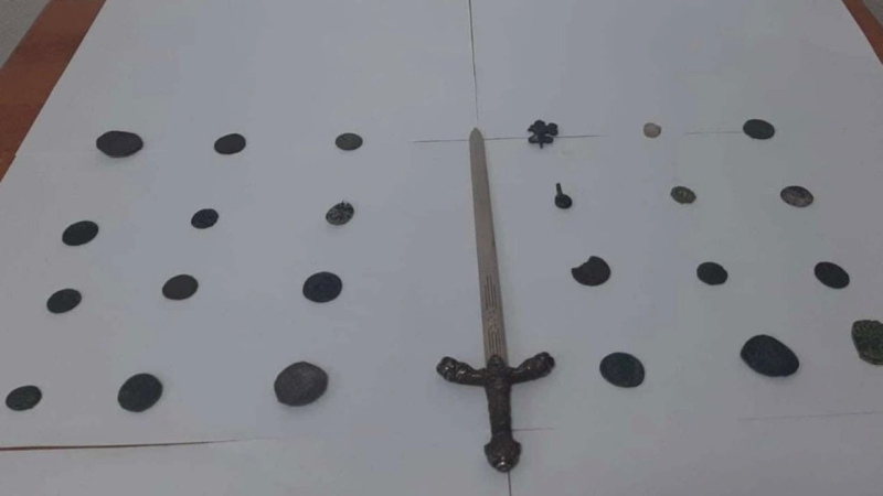 Zanlıların üst aramasında ve ellerinde bulunan poşetlerde tarihi eser niteliğinde olduğu değerlendirilen 51 obje, 24 sikke ve bir kılıç ele geçirildi.