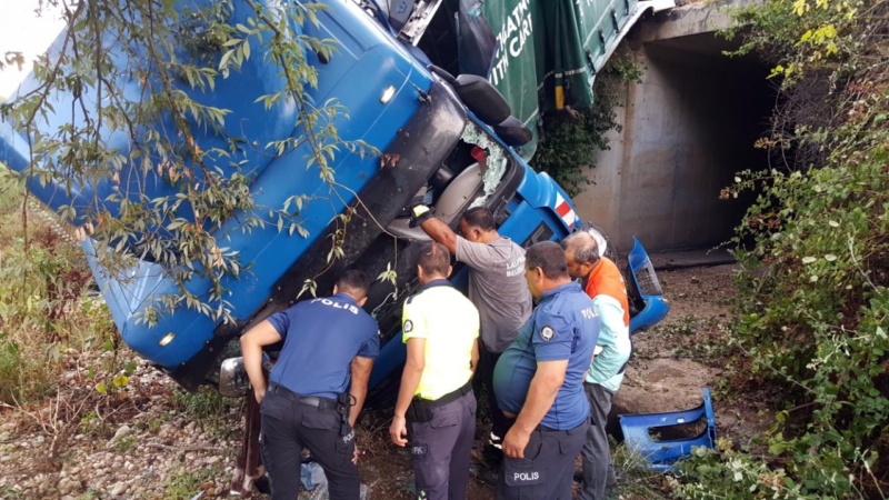 Romanya uyruklu Tıvıg Lon’un kullandığı AG 13 JLD plakalı tır, ilçe girişinde yol kenarına devrildi.