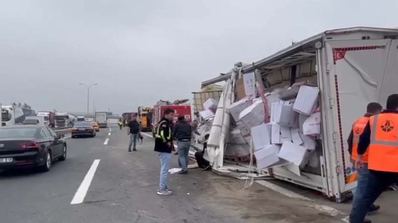 Çarpmanın etkisiyle dorsesinde çakmak gazı yüklü olan kamyon yola devrilirken, TEM Otoyolu İstanbul istikameti ulaşıma kapandı.