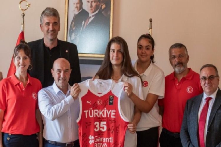 İZMİR (İGFA) – 11-19 Ağustos 2023 tarihleri ortasında İzmir’de düzenlenen 16 Yaş Altı Kızlar Avrupa Şampiyonası karşılaşmaları kapsamında 15 Ağustos Salı günü (yarın) Finlandiya ile maça çıkmaya hazırlanan ulusal kadro oyuncuları İzmir Büyükşehir Belediye Lideri Tunç Soyer’i ziyaret etti. Egemenlik Evi’nde yapılan toplantıya İzmir Büyükşehir Belediyesi Gençlik ve Spor Dairesi Lideri Hakan Orhunbilge, ESHOT Genel Müdürü Erhan Beyefendi, Türkiye Basketbol Federasyon As Lideri Hüseyin Beşok, 16 Yaş Altı Kızlar Ulusal Ekip Baş Antrenörü Olcay Orak, Ekip Kaptanı Şeyma Yılık, Kadro Menajeri Ceyda Kozluca Kabaran ve oyuncu Berfin Şahin katıldı. Kadro kaptanı Şeyma Yılık, oyuncuların imzaladığı formayı günün anısına Lider Soyer’e verdi.