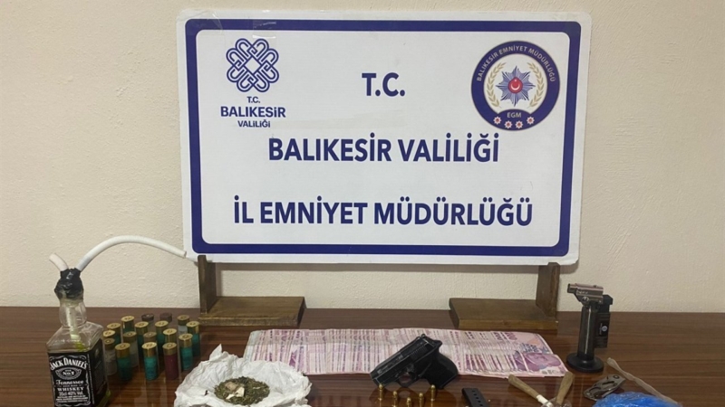 Yapılan aramalarda 36 gram metamfetamin, 28 gram esrar, kurusıkıdan bozma tabanca ve 5 adet fişek, 17 adet av tüfeği fişeği, 3 adet uyuşturucu içme aparatı, suçtan elde edildiği değerlendirilen 17 lira ile 2 adet içime hazır sarılmış esrar maddesi ele geçirildi.