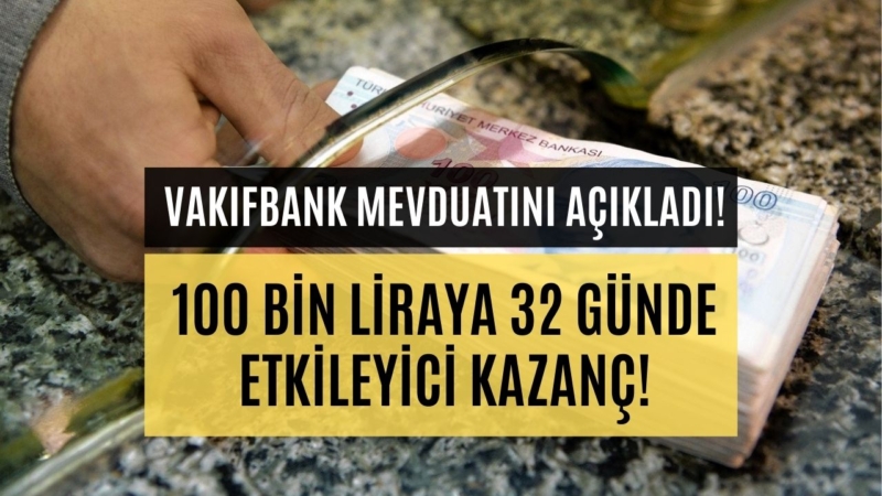 Vakıfbank güncel mevduat oranlarına göre 100 bin liraya yüzde 22 faizle 1.832 TL kazanç verildiği hesaplandı. Yani, 100 bin lirasını Vakıfbank’a yatıran, 32 günde 101.832 TL alacaklar.