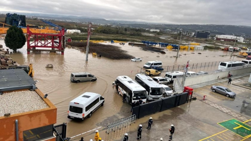 Yolların su altında kaldığı alanlarda iş yerlerine geçiş yapamayan işçiler, tersanelere ait iş makineleriyle yolun karşısına geçebildi.