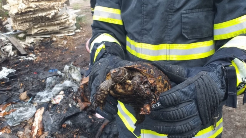 İtfaiye personeli, söndürme çalışmaları sırasında bir kaplumbağanın alevlerin arasında kaldığını fark etti.